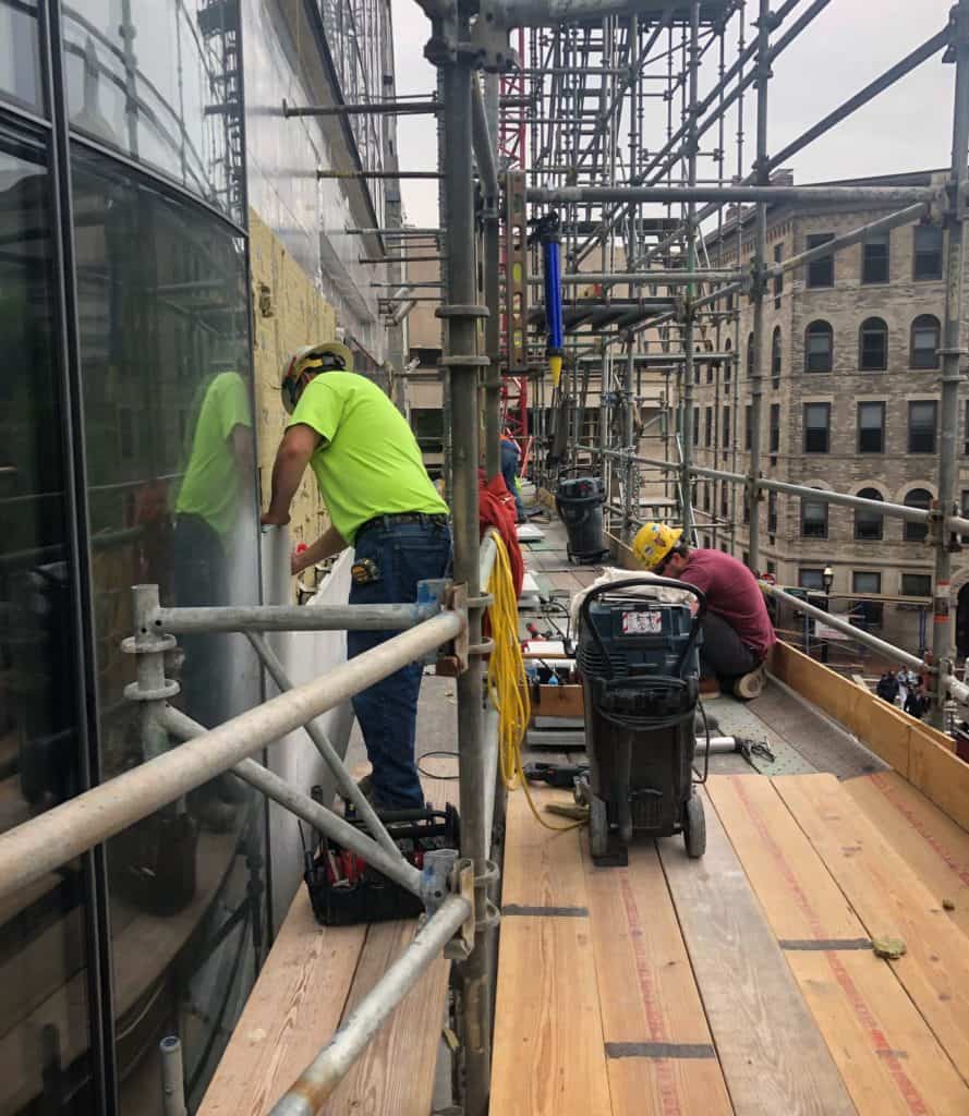 A common platform was erected at One Dalton, as well as swing staging to access the sheer concrete walls for glass installation. / photo by Tom McCafferty, Marr Scaffolding