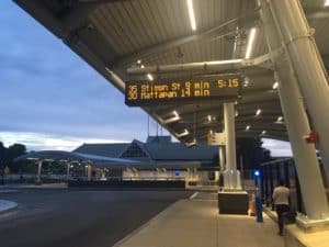 (above and below) The new Forest Hills Station upper busway canopy features custom Lumenpulse main fixtures, WE-EF decorative LED lighting, and variable message information display systems.