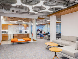 Interior finishes were also selected for their natural and organic feel. Wood strip ceilings, cork flooring, and a live-edge elm island top are designed to contribute warmth to the space. Veined quartz counters, carpet, and porcelain tiles were chosen for their organic patterns, and acoustical felt wall panels were designed in an organic wave pattern across the lobby accent wall. An eclectic mix of light fixtures is also reminiscent of forms found in nature. In open office areas, amoeba-shaped light fixtures connect and flow across open-to-structure ceilings. Lights in boulder and helical shapes and mini-globe pendants, suspended in a wave pattern, take center stage in the cafe.