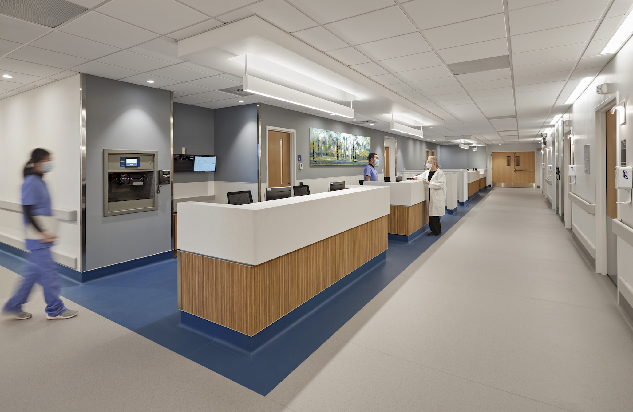 The unit is located within the sixth floor of the hospital’s Connell Building, which was built in 2009, with shelled upper-floor space included in anticipation of future demand for additional patient beds on the hospital campus. While a conceptual design of this unit had been completed in prior years, the hospital didn’t begin full design in earnest until March of 2020.