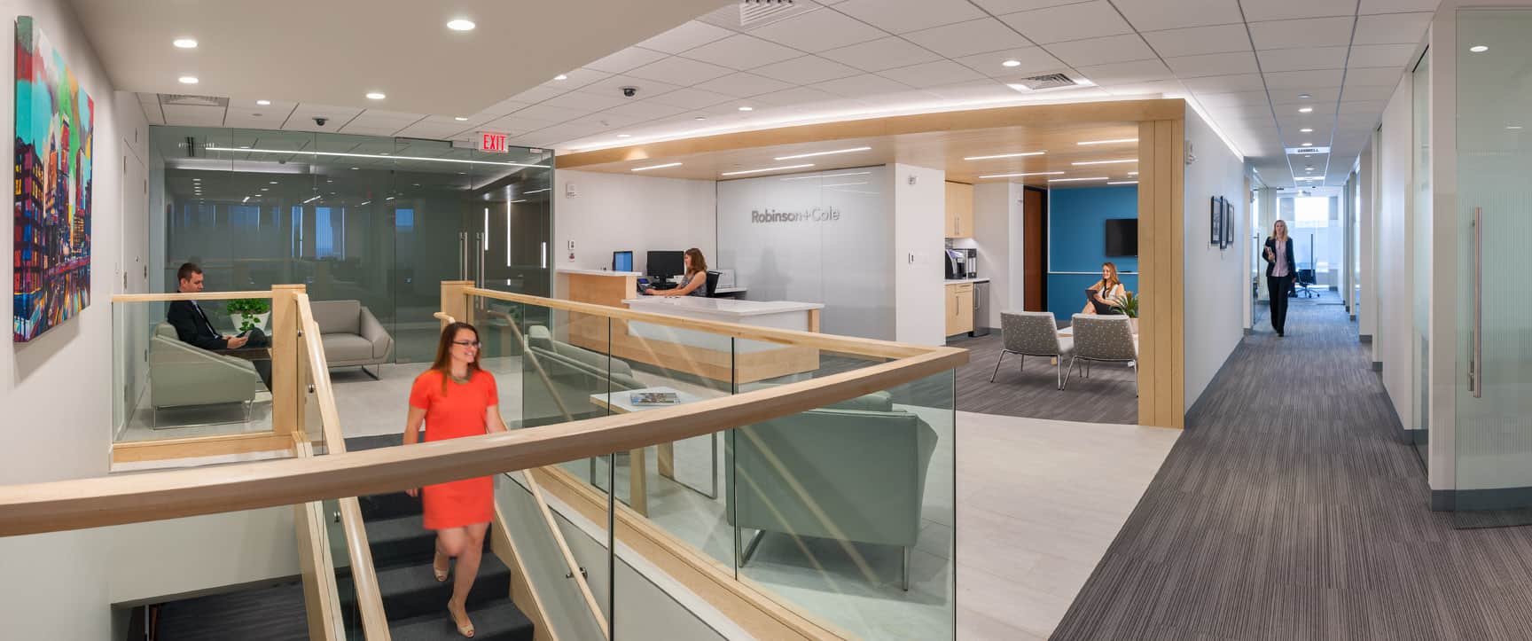 With an emphasis on natural light and warm neutral colors, MPA’s design created an open and modern reception area to welcome visitors. Underutilized areas in the old office were condensed to accommodate new common use functions, such as showers and other support areas. The break room was also significantly upgraded with new finishes and furniture. In order to allow Robinson+Cole’s business to continue during construction, MPA phased the renovation schedule and utilized available swing space.