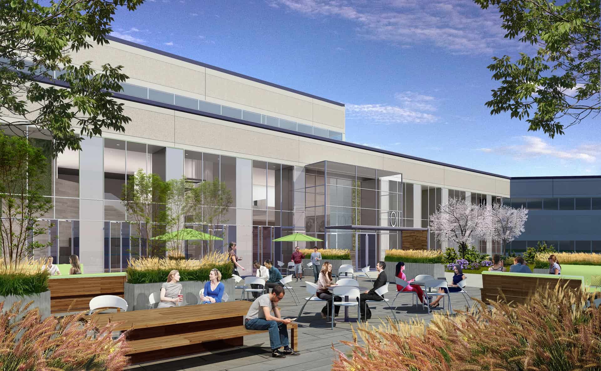 To open the building to more natural light, MPA repositioned the front entrance forward and redesigned the front façade with a new dynamic self-tinting glass curtainwall. Providing a more gracious entrance on approach, the front entry also features a new canopy, landscaping, and outdoor gathering places around a central fireplace.