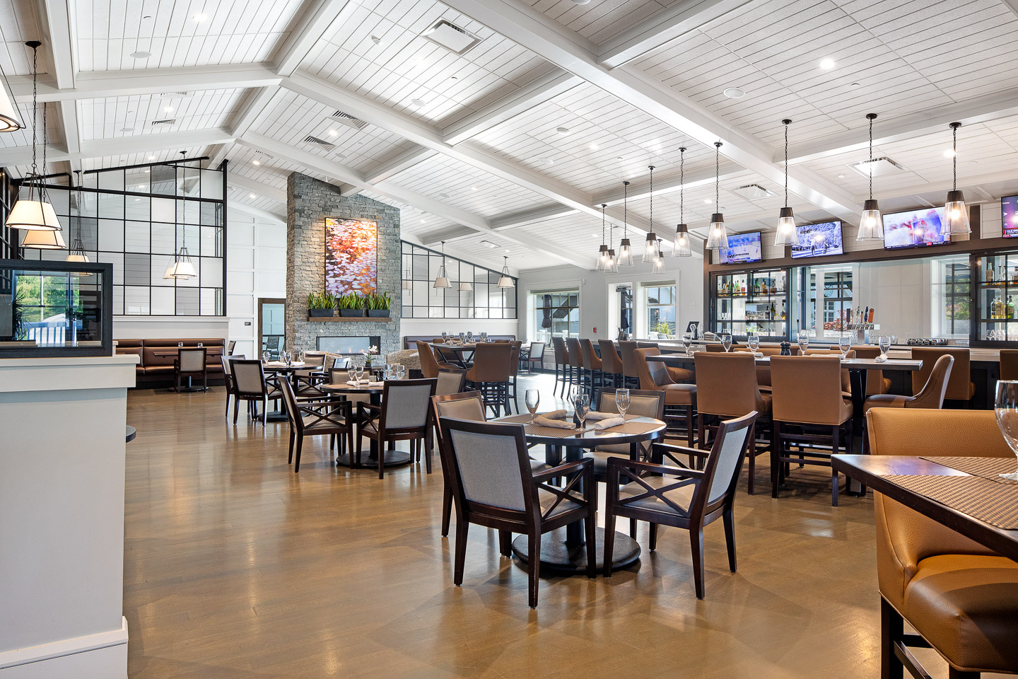 The new facility provides a modern farmhouse-style clubhouse designed with clean lines, contrasting materials, and human-scale proportions featuring expanded wellness, fitness and dining amenities, and event spaces.