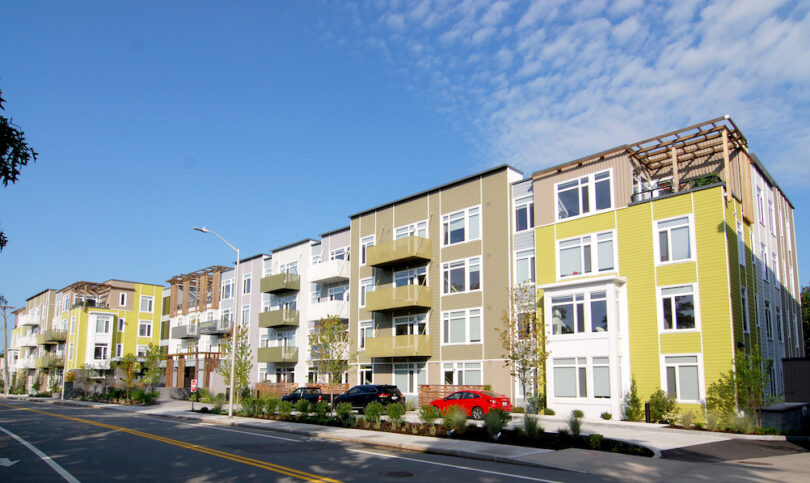 Oversized, triple-pane, acoustical windows provide an abundance of natural light to the apartments, and select units include balconies and terraces. The colorful exterior facade is a combination of board and batten siding, metal wall shingles, green and gray clapboards and stone veneer.