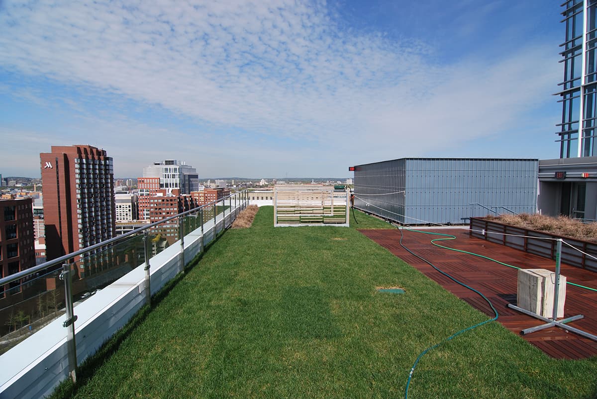The second floor terrace is constructed of an energy-efficient roofing membrane designed to resist ultraviolet, ozone and chemical exposure. Brazilian hardwood and concrete pavers were constructed above the membrane to provide seating and meeting space along with newly constructed badminton and bocce courts. The 21st floor rooftop terrace offers breathtaking panoramic views of Cambridge, the Charles River, and Downtown Boston. The 3,000sf terrace features Brazilian hardwood decking, concrete pavers, seating and meeting space with high-end finishes, custom-fabricated planters, living walls, drought-tolerant grasses and plantings.