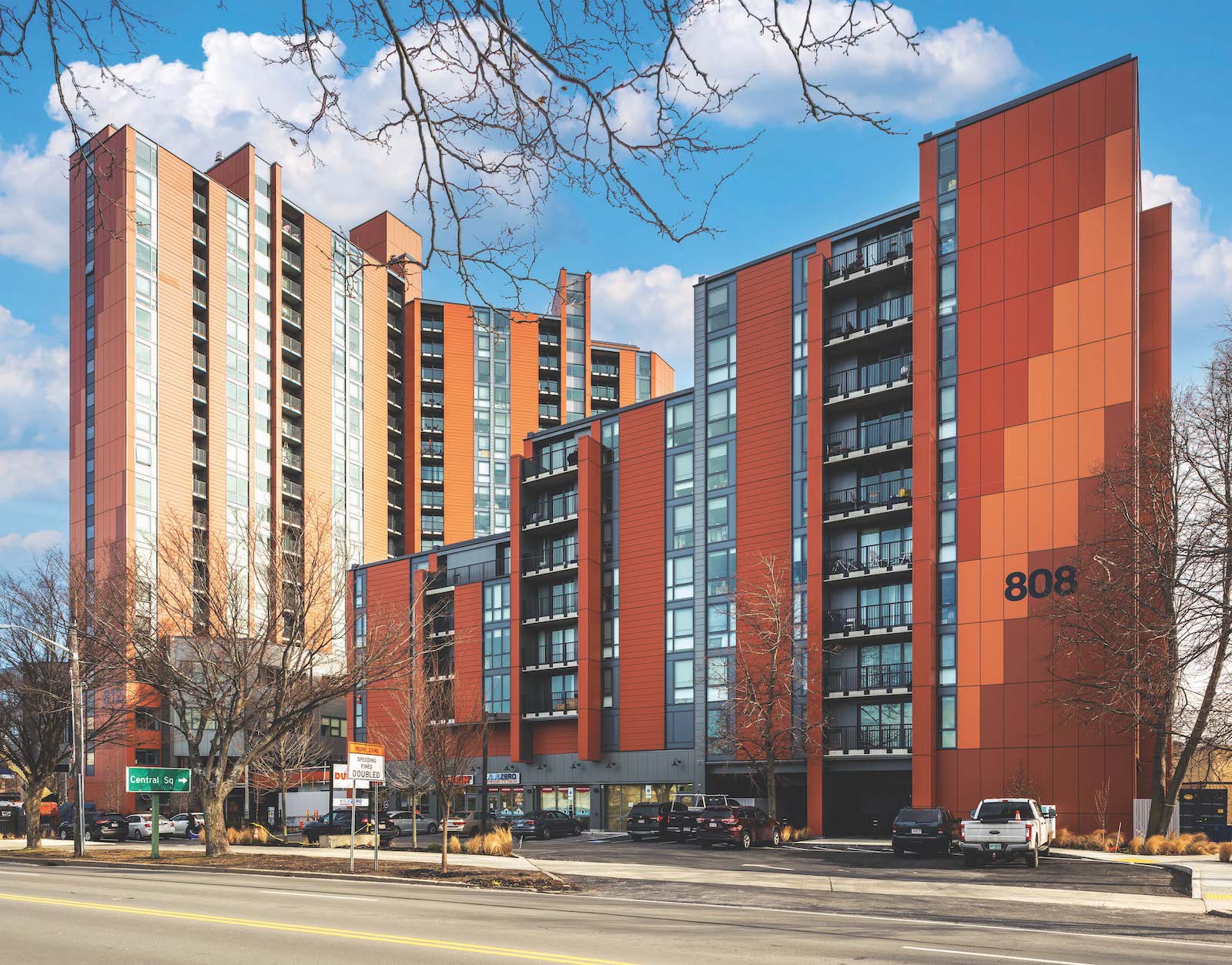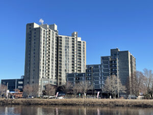 Located at 808-812 Memorial Drive in Cambridge, the Rivermark complex contains 89 apartments in a 10-story building, 211 apartments in a 19-story building, 38,000sf of commercial space, and five levels of parking. Of the 300 units, 212 will be for low-income residents and administered by the Cambridge Housing Authority. The remaining 88 apartments will be rented at market rates. Designed by Bruner/Cott, work began in 2020 and was completed in December 2022.