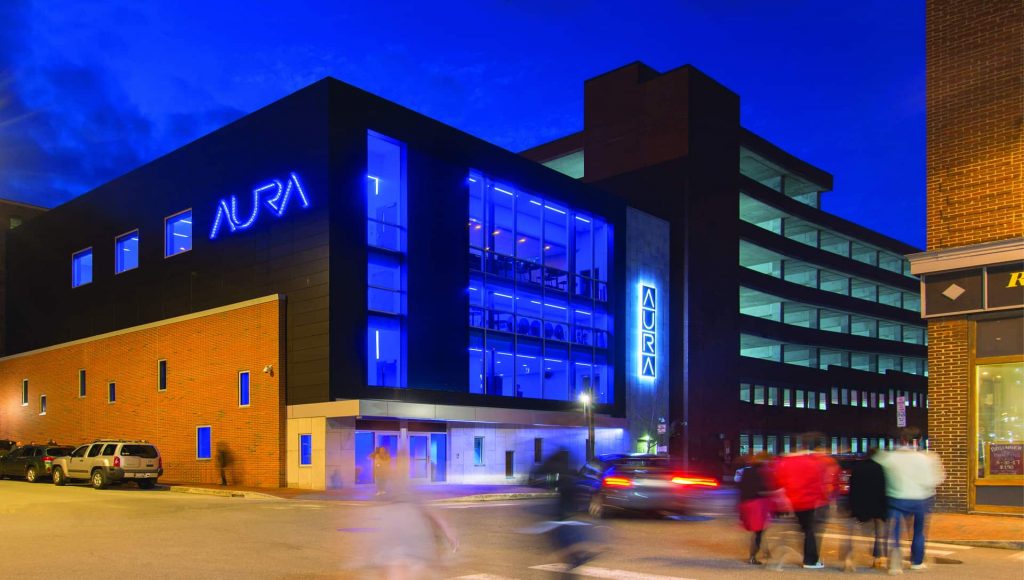 Portland, ME – Downtown Portland has an eye-catching new entertainment venue on the corner of Center and Free streets. Aura (formerly Asylum) opened in late April to enthusiastic reviews.