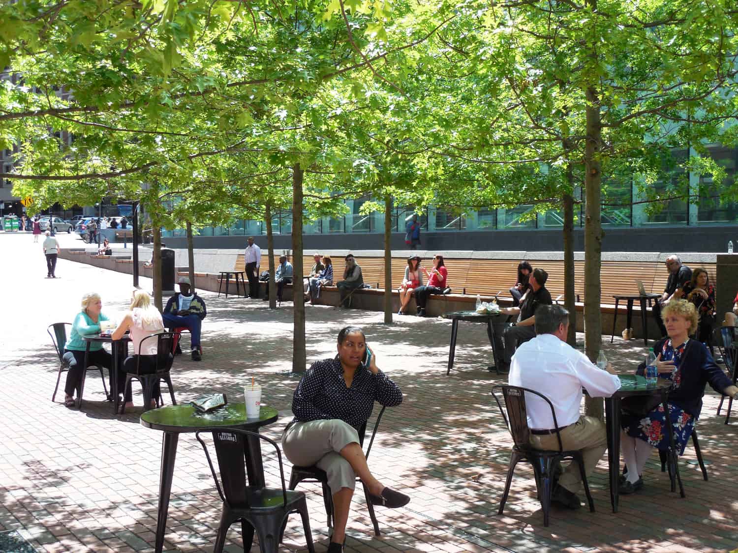 With the introduction of new gathering spaces and a variety of seating opportunities, the plaza now has daily visitors soaking up the sun or enjoying their lunch at bistro tables under the dappled shade of large canopy trees. Not only do these tree bosques help define the edges of the plaza and offer respite for residents, workers and tourists, there are a number of direct environmental benefits of the trees that will set the tone for a resilient future. The tree bosques reduce the heat island effect and are planted in an open jointed permeable paving system, increasing the life expectancy of the trees while maximizing stormwater infiltration on the plaza.