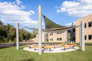 The cafeteria brings nature in with cedar decking, stone, and views of the entrance plaza and wooded landscape.