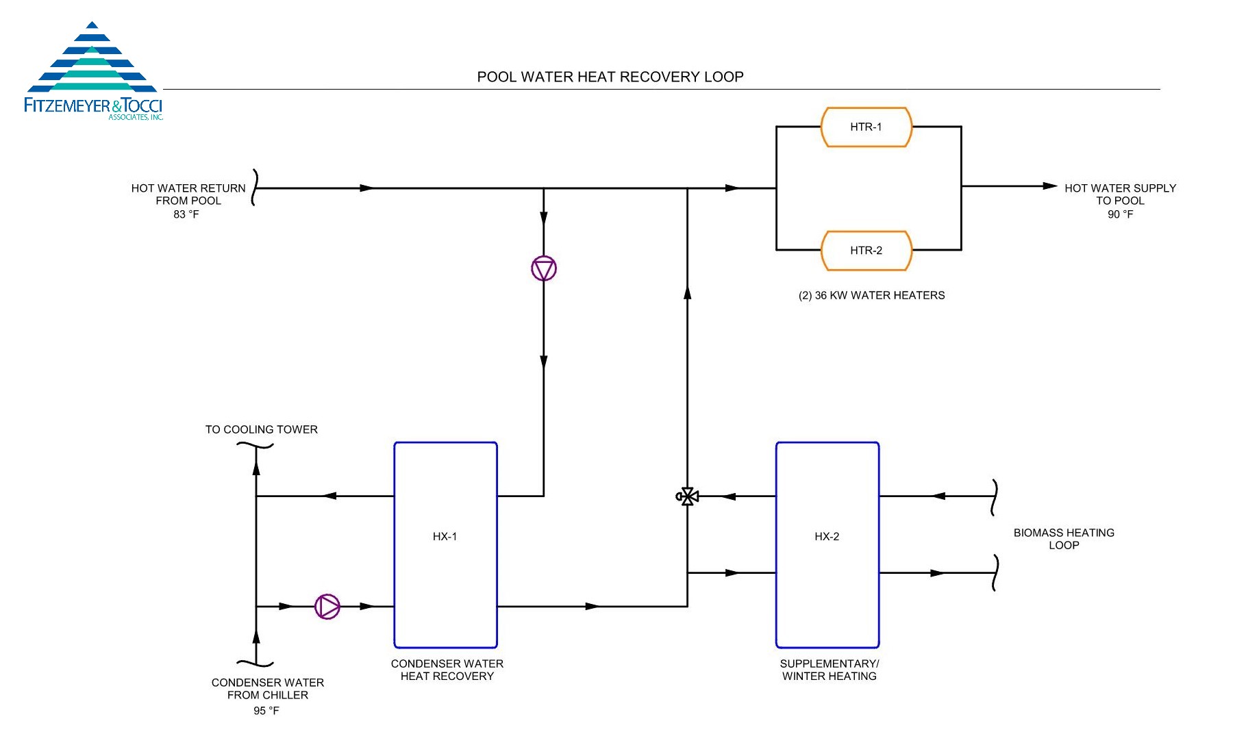 In addition to the condenser water heat recovery system, a second heat exchange system was installed to use heat from the campus’ woody biomass building heating system to supplement the condenser water heat recovery system and for primary pool water heating during wintertime.