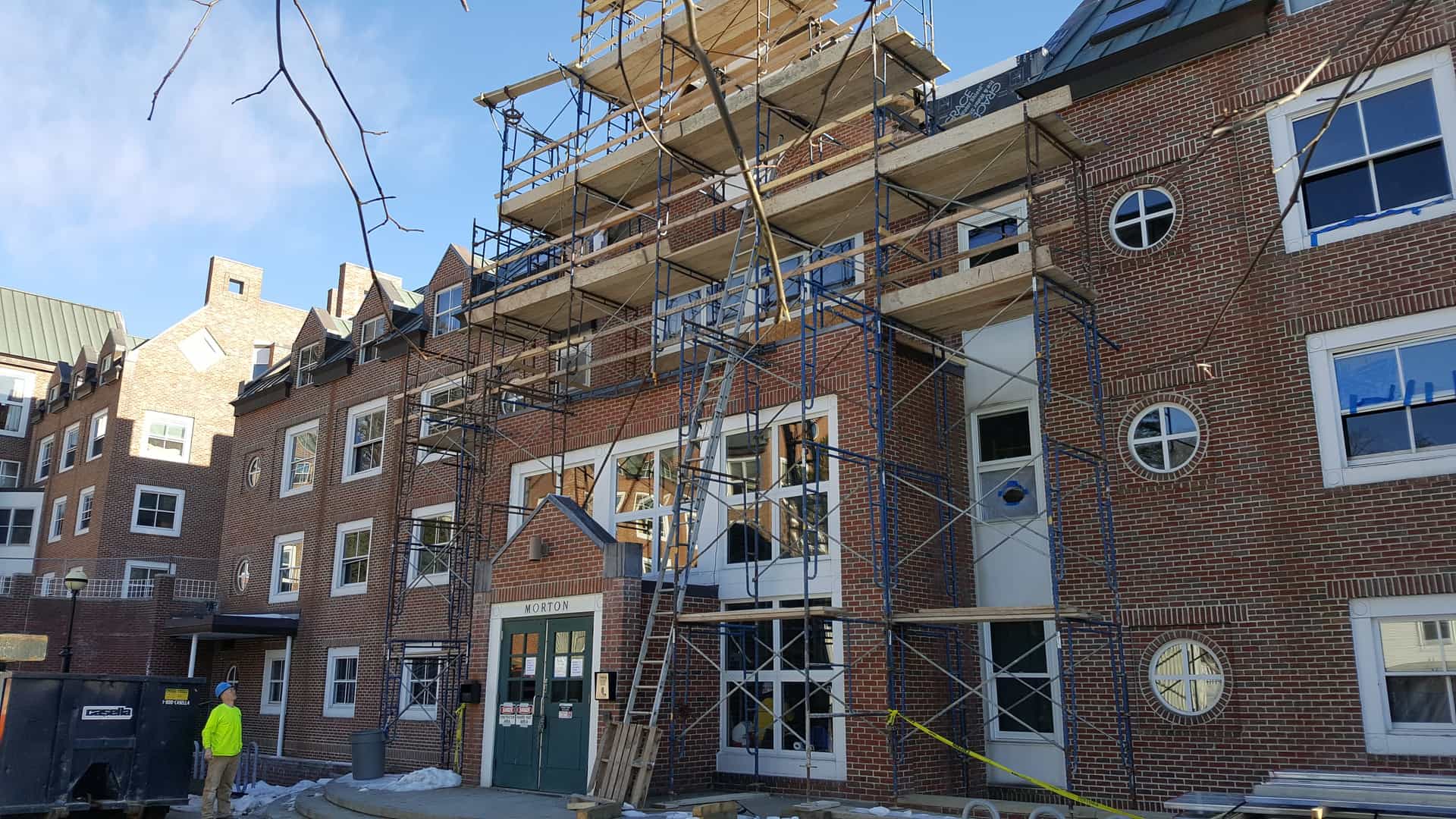 Hanover, NH – North Branch Construction of Concord continues work on the fast-track total gut renovation of Morton Hall at Dartmouth College. Following a four-alarm fire that occurred at the dormitory in October 2016, North Branch Construction was hired to perform the extensive reconstruction of the building based on their experience with disaster recovery. The College will be taking this opportunity to incorporate a new layout into the dormitory, increasing the number of beds and installing an elevator.