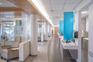 The first phase of the 26,000sf emergency department addition and renovation recently opened, and includes a new waiting room, reception area and triage rooms. When fully completed the new emergency department will include 28 treatment rooms divided into “pods,” two consult rooms, and three new trauma bays. The main challenge of designing the emergency department was that it needed to be constructed directly in front of the existing emergency drop-off and main entrance, while remaining operational during the entire renovation. The overall design accommodates heightened infection control measures with design improvements to isolate flow in waiting and triage, increase ventilation and air filtration systems, and increase preparedness for a surge of capacity for future mass health events.