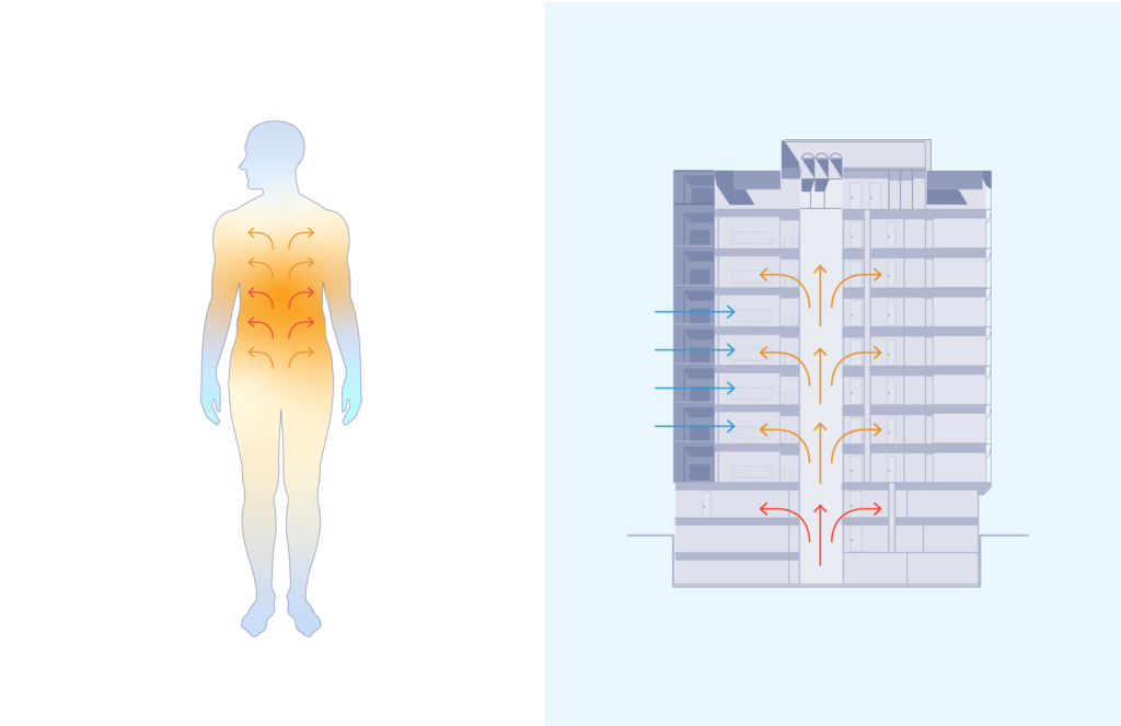 Like the blood in our bodies, buildings can mimic our human biology by using water to move that internal warmth to the perimeter as well.