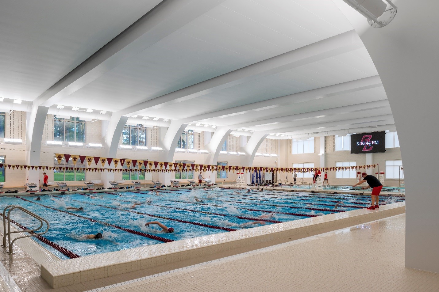 Boston College’s new precast concrete recreation center solidifies its culture of fitness and recreation. The $127 million, 245,000sf facility provides students with a one-stop fitness destination. The four-story structure includes a 25-meter swimming pool, multi-purpose courts, an elevated jogging track, climbing wall, wellness room, yoga studios, fitness rooms, training rooms, locker rooms and other amenities.