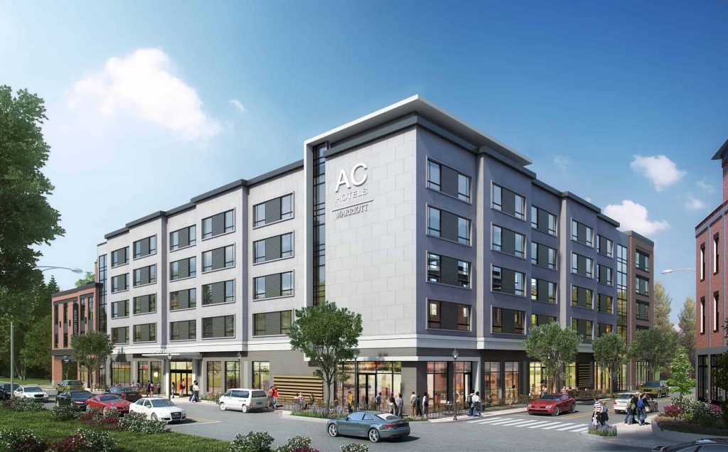 The five-story design features 154 guest rooms in stylish finishes with the AC’s signature wall-mounted workspace and seating bench. The hotel’s décor is modern, high-tech, minimalist, and designed to appeal to Millennials and business travelers. Guest amenities will include a fitness center with a dedicated yoga room, a lounge/bar, a library, a 24×7 market, and 24-hour business center. An additional 2,360sf of first-floor leasable office and retail space will also be available.