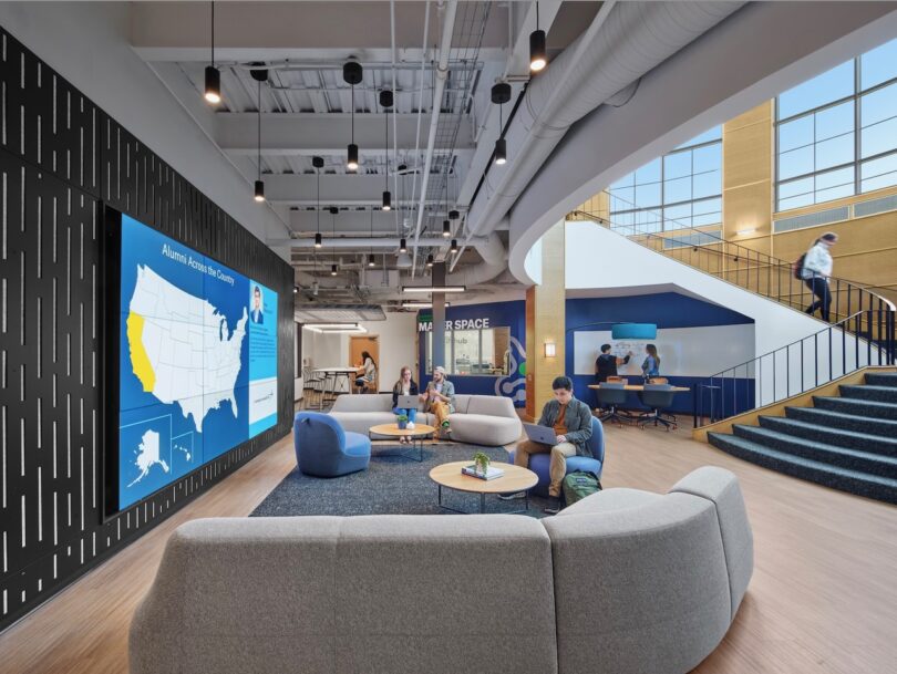In the student lounge’s meeting and gathering area, the renovation focused on adding collaborative offerings while maximizing available daylight and openness. Six new huddle rooms set at the back of the main open area offer moveable tables and chairs for four-to-six occupants set inside sleek transparent enclosures with linear pendant lighting fixtures. Nearby, two new double-height study areas and two enclosed makerspaces draw students past two grand staircases flanking the triple-height space for socializing and small group work.