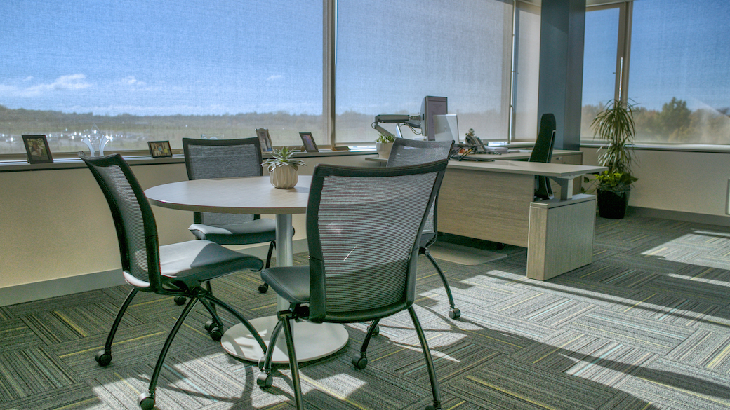 The team began by replacing conventional drywall office fronts with glass storefronts to allow for improved natural light, exterior views, and a sense of openness between the offices and center core work areas. While existing workstations within the center core were reduced in size, they were updated with a variety of amenities that supported both permanent and hoteling work styles. A major emphasis was put on creating a variety of meeting and collaboration settings that included focus rooms, smaller meeting rooms, a formal conference room, a MS Teams meeting room for combined in-house and remote meetings, a training room, and a variety of informal social spaces designed to encourage team development and greater collaboration.