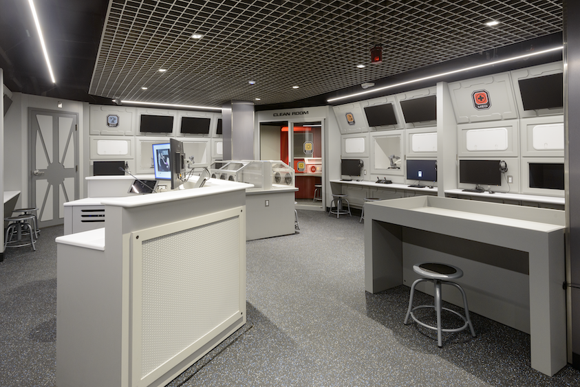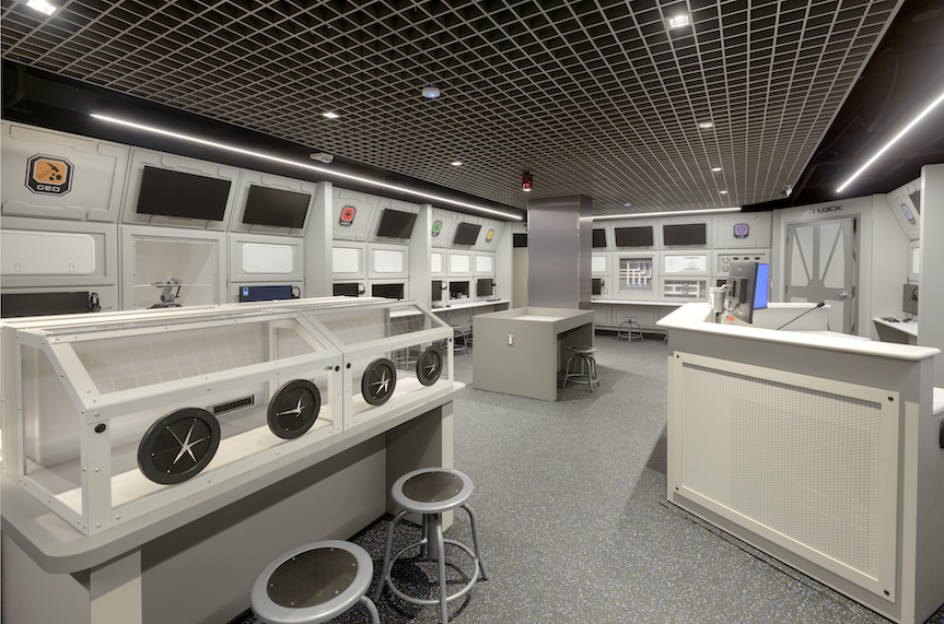 Interior finishes, graphics and design elements were coordinated to promote excitement and interest in space study.