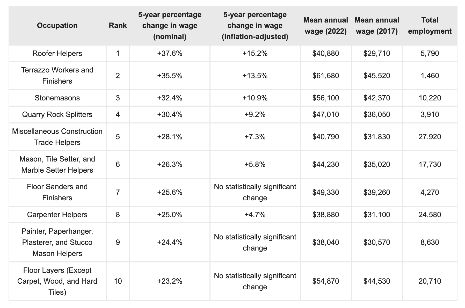 The report found that, more so than by location, wages in the construction industry vary widely by occupation, and some roles have shown more recent wage growth than others. To find the construction jobs with the fastest-growing wages, researchers at Construction Coverage analyzed the latest data from the U.S. Bureau of Labor Statistics. The researchers ranked all construction and extraction occupations according to the five-year percentage change in wages from 2017 to 2022. In the event of a tie, the occupation with the higher mean annual wage in 2022 was ranked higher.