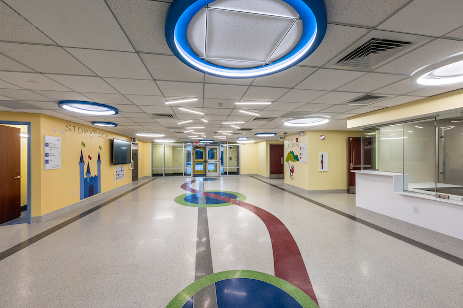 Exterior murals by Quincy resident Brandon Eames feature whales, dolphins, turtles and other sea life, while the interior offers a soothing color palette and place-making graphics depicting different natural settings, including a water world, a rainforest, and representations of the four seasons.