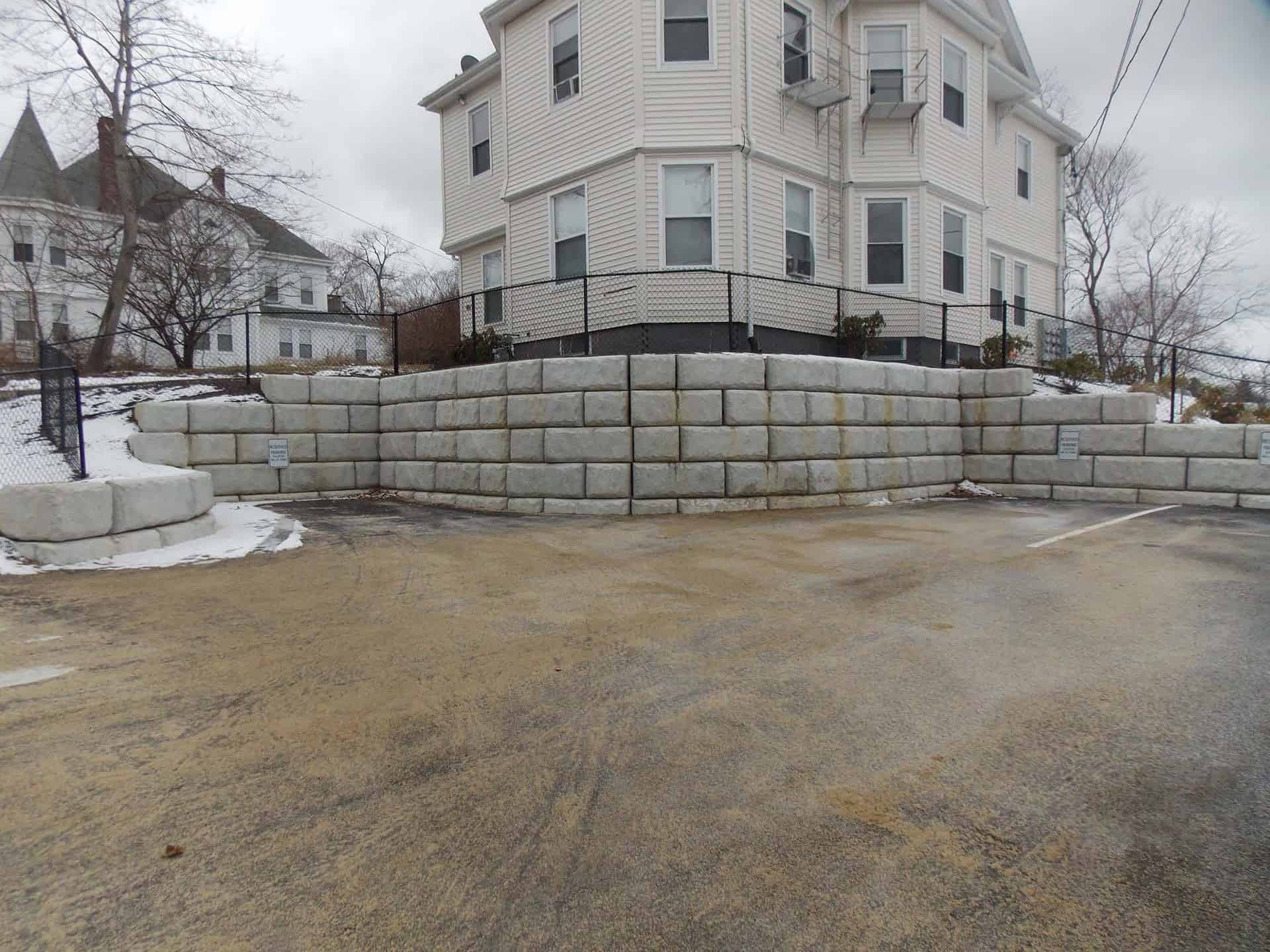 Benway explained, “The site is on the side of a hill, and in order to create enough room for parking it was necessary to construct several retaining walls. Some of the walls have parking above and below them. The retaining walls were constructed from large concrete blocks. The contractor selected these blocks because no reinforcing grid would be required and the blocks go up quickly, thereby not impacting neighboring properties and reducing the time that the excavation needed to be open to the elements.”