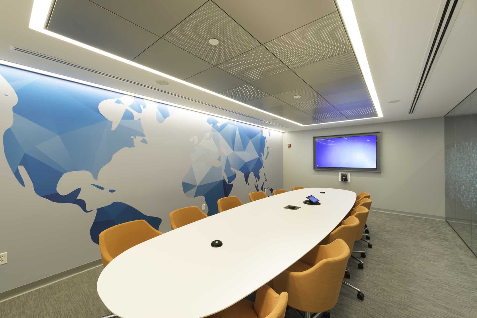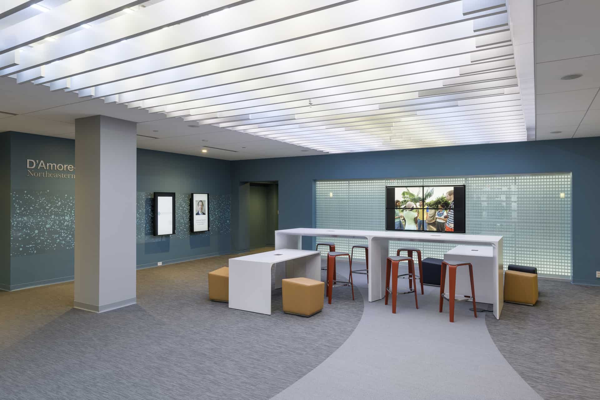 In partnership with CBT Architects, Shawmut installed custom features such as baffle ceiling fixtures backlit with color-changing LED lights, radius millwork soffits, woven vinyl flooring, and bench walls with built-in backlit signage.