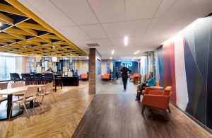 The eye-catching white neon “T” in Trinity, displayed against a dark navy colored wall, captures the college’s strong brand principles. The ceiling grid is open to the plenum above and maximizes the space volume while making a bold statement with dual-color schemes that change from yellow to blue from East to West.