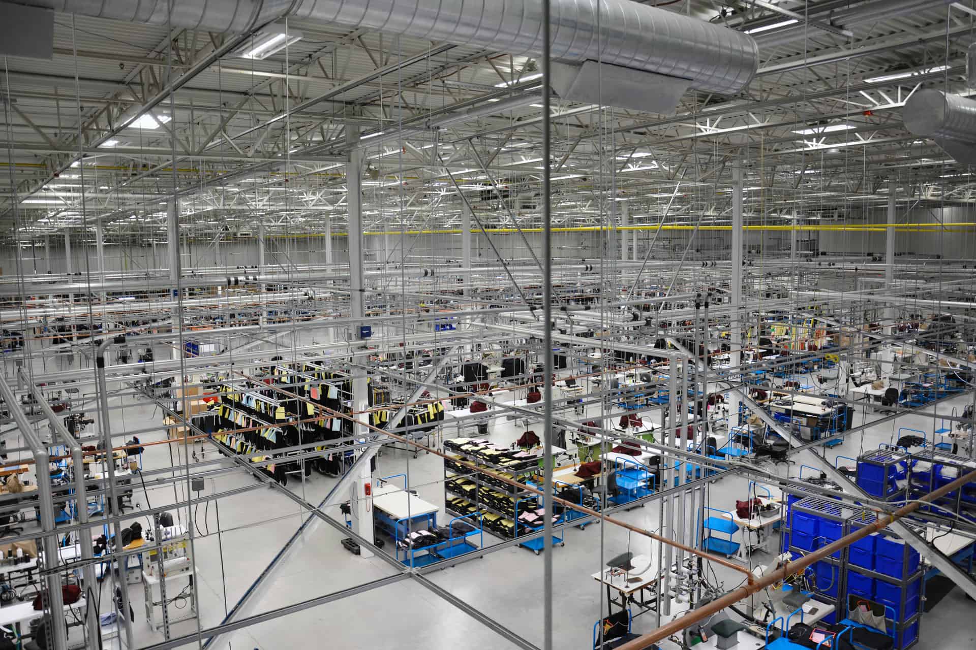 Process systems required for 450 independent sewing stations included a metal Unistrut grid to support compressed air and vacuum systems, a steam system which included two high-pressure steam boilers and all new piping and controls, new LED lighting throughout, resealed concrete slab, and electrical distribution.