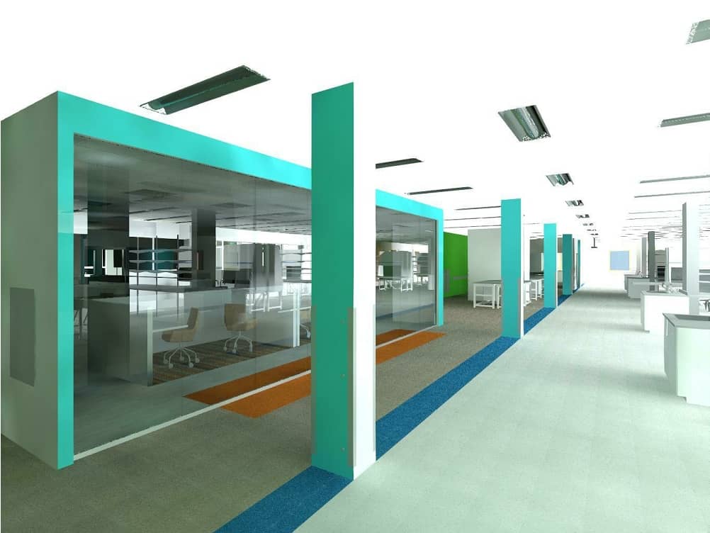 SQZ Biotech has a youthful, energetic culture and wanted that to come across in the design of their new space. One of the first decisions was to create on open ceiling in the office area, exposing ductwork, piping and bar joists in an informal, hip, industrial way. Large walls are painted in vibrant cyan, orange and green accent colors that reflect the company logo and graphics. Using Interface plank carpet tile with intense orange weaves, the open workstations will be set upon a field of carpet that evokes rapid movement.