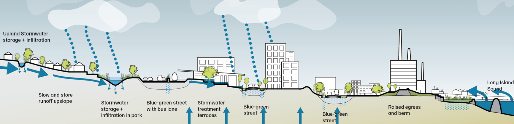 The project includes the continuation of a Rebuild by Design pilot project, a $6.5 million stormwater system designed by Arcadis, Waggonner & Ball, and Yale Urban Design Workshop, with Reed Hilderbrand.