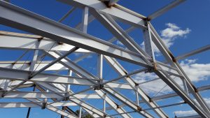 The trusses support energy-efficient structural insulated panels that are factory-built and comprised of structural wood sheathing and rigid foam insulation. The roof structure is supported on a steel frame with a steel and concrete framed floor below. This framing provides lateral support to the existing building as well as the new addition.
