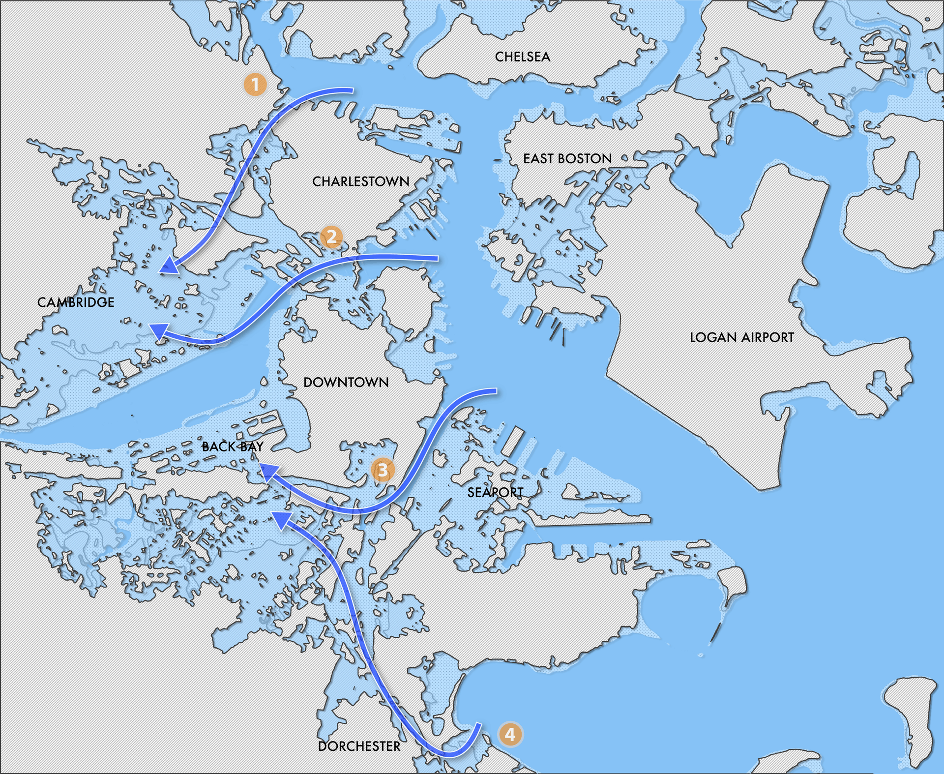 Zooming out from Cambridge, the problem becomes evident at an urban scale (figure 2). With a five foot sea level rise, four flow-ways in Boston will allow free passage of ocean water into the Charles River and the neighborhoods that touch it. These are: 1) the Charlestown Flow, 2) the North End Flow, 3) the South Boston Flow, and 4) the Dorchester Flow. We have named these after Boston neighborhoods to emphasize that each originates in Boston, and are coincident with the low lying necks of the original landforms of the 1600s (figure 3). Unlike floods, these flows do not recede.
