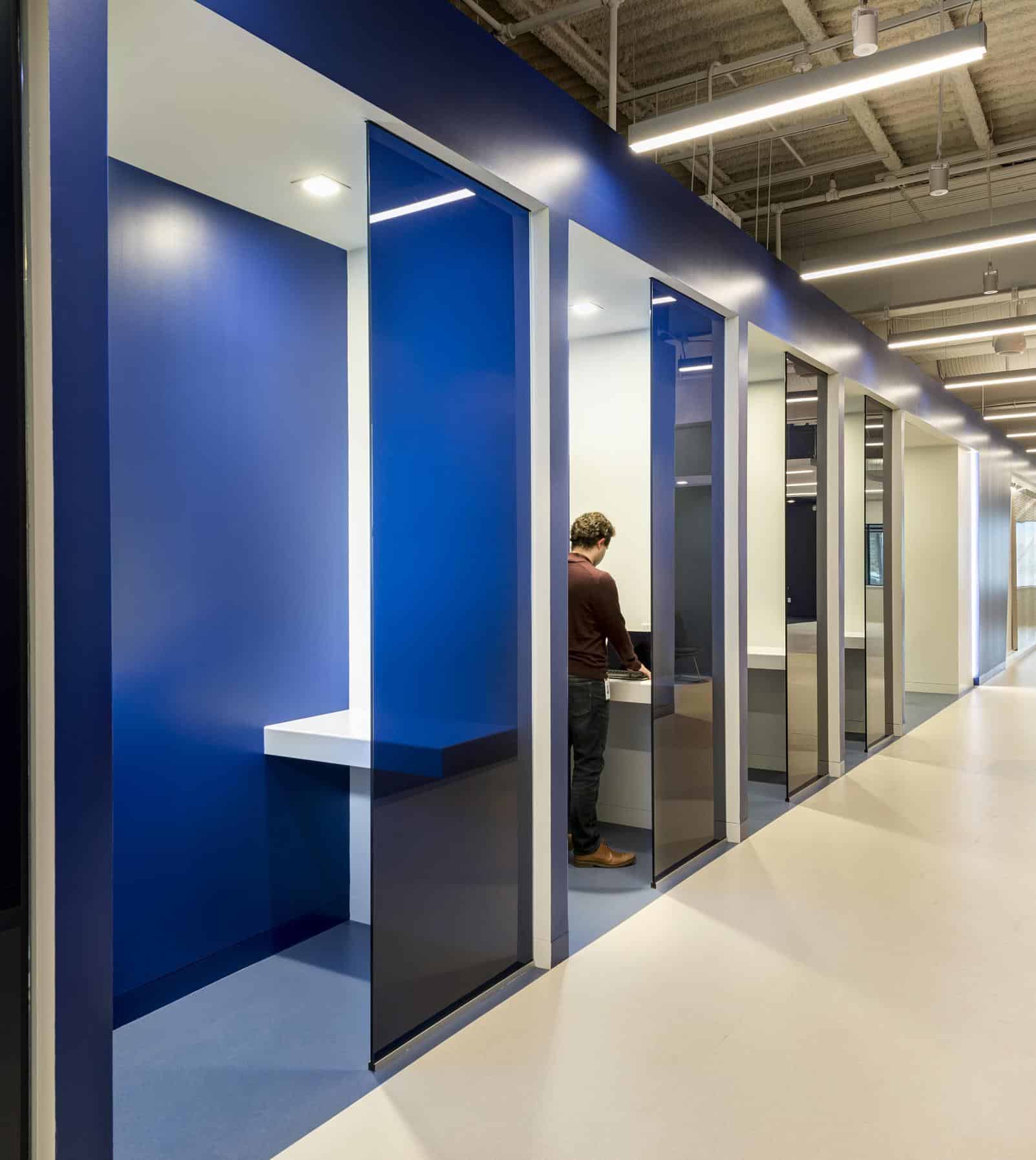 Our working theory was that, for these spaces to be successful, balance between what is taken from and what is given to the employees is essential. We know from the many articles warning us about removing private offices that noise and distractions must be avoided. Acoustics, then, must be a priority.