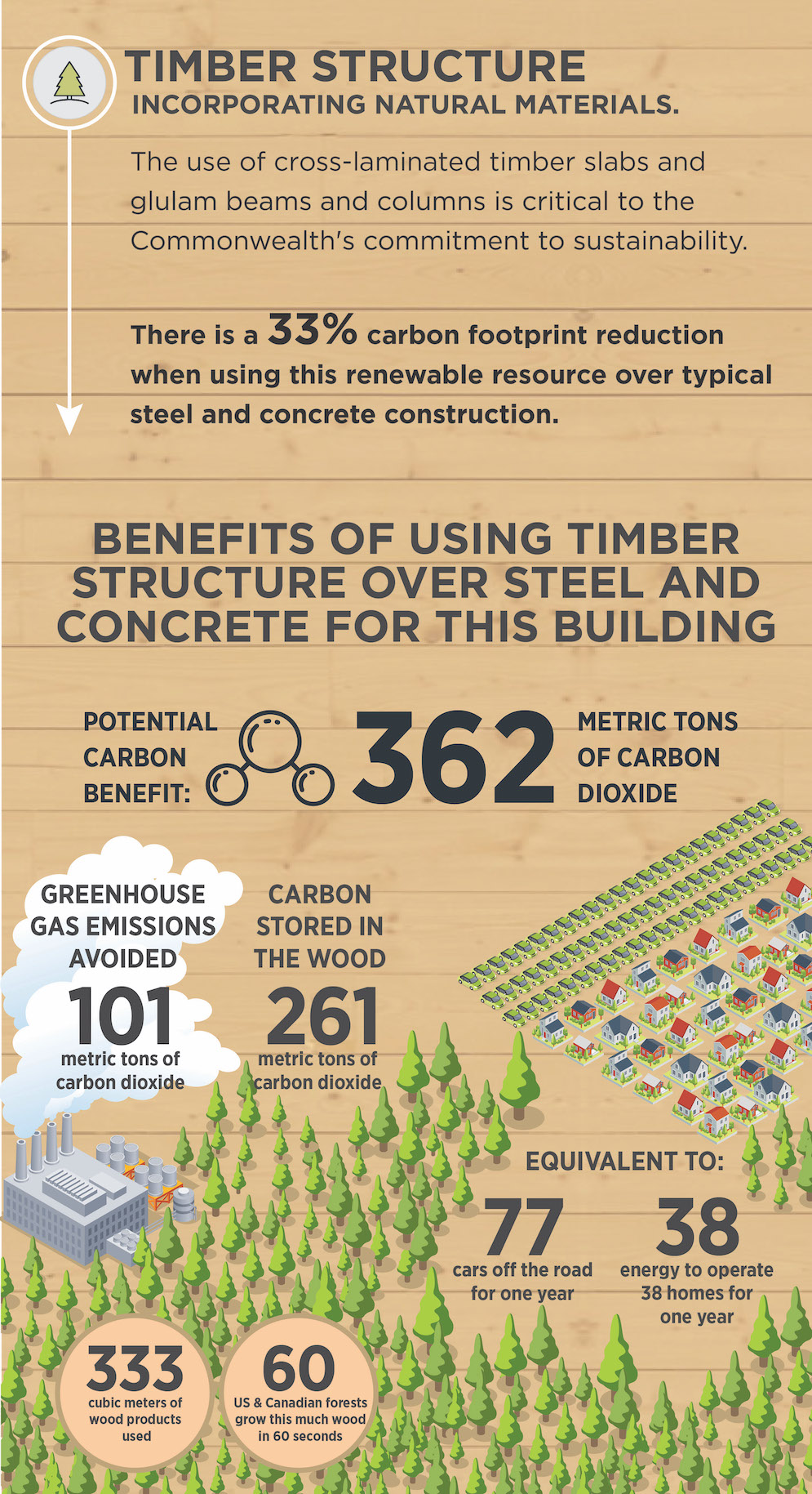 The environmental benefits of mass timber buildings show up in major ways, both reducing carbon emissions and increasing carbon sequestration – about 360 metric tons of carbon benefit on this project.
