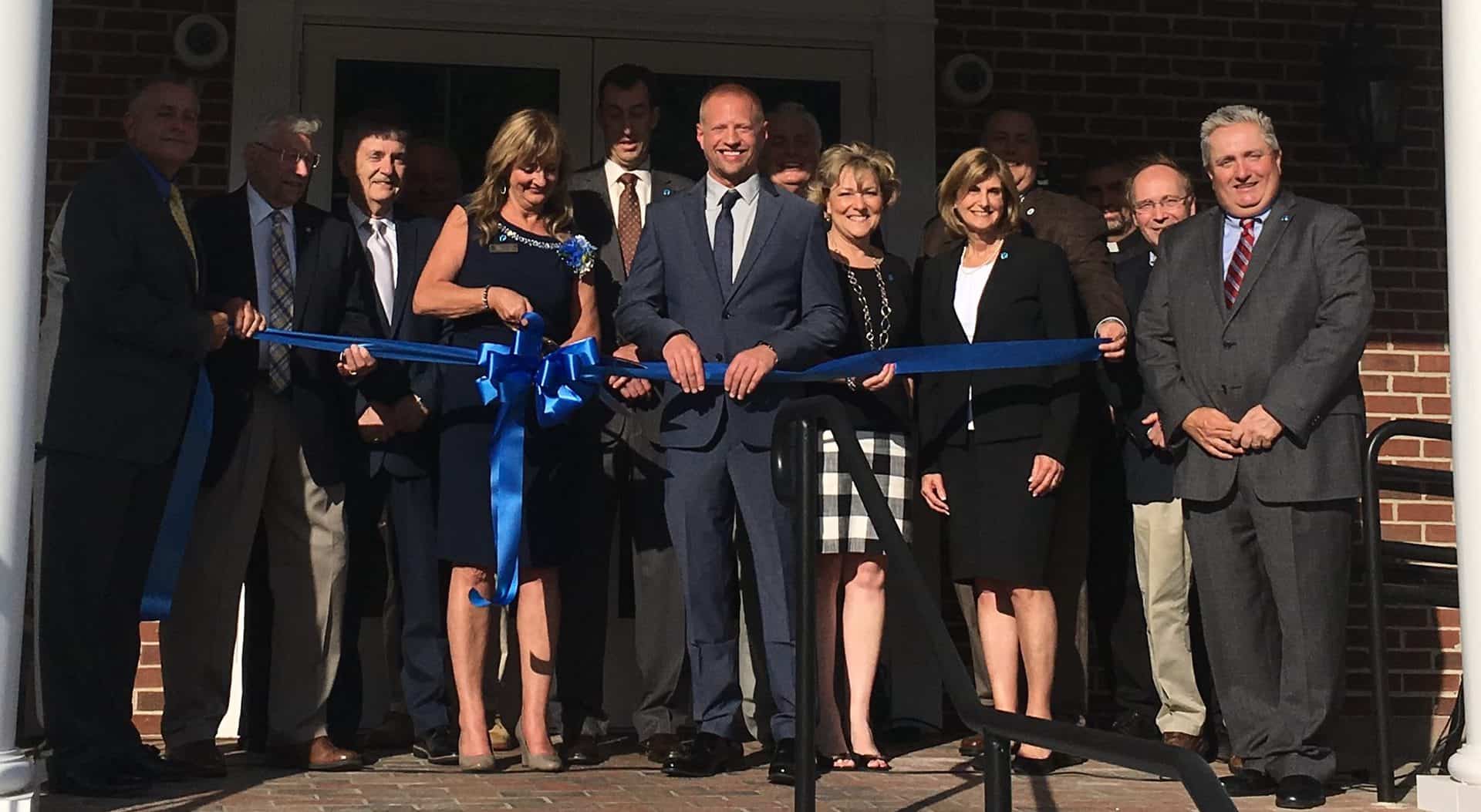 Robert Scannell, town manager; Illona Blouin, branch manager; Stephen Lewis, CEO and president; Jason Davis, QA+M Architecture (center); George Seabourne, chair, Thomaston Savings; and board members Susan Sadecki, Carrie Zimyeski, Jim Kaniewski, and Jim Nichol.