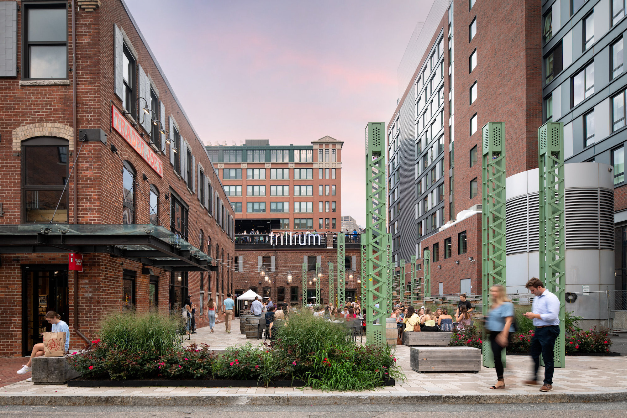 The plaza incorporates several elements that recall Fort Point’s history as an industrial hub and rail yard. Metal stanchions, used to hold up the lighting elements of the plaza, derive their form from the historic Northern Avenue Bridge structure. Precast concrete unit pavers recall the design of the rails that used to carry freight through Fort Point’s narrow alleyways. Seating elements are inspired by the wooden pallets that were once an omnipresent sight in Boston rail yards.