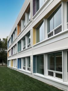 The building’s design features large white precast concrete panels with expansive window cutouts on the east facade, fostering a strong visual connection between the building and its surroundings. These deeply set windows, surrounded by bright-colored terra-cotta tile inlays, correspond to the accent colors of each classroom, enhancing the building’s visual appeal. The west end showcases a modular grid of smaller precast concrete panels, embedded with terra-cotta tiles, creating a dynamic and textured exterior.