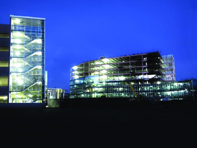 The limited site boundaries for the size of this project required the excavation and disposal offsite of a mountain of earth (300 dump trucks per day for nearly a three-month period), which additionally required the construction of a 50-foot-high/300-foot-long soil nail retention wall—the largest such wall in the state. Additionally, the team had to obtain permits for the foundations and structure in that three-month time frame. Other challenges included working on an occupied campus and building the garage and Outpatient Pavilion simultaneously.