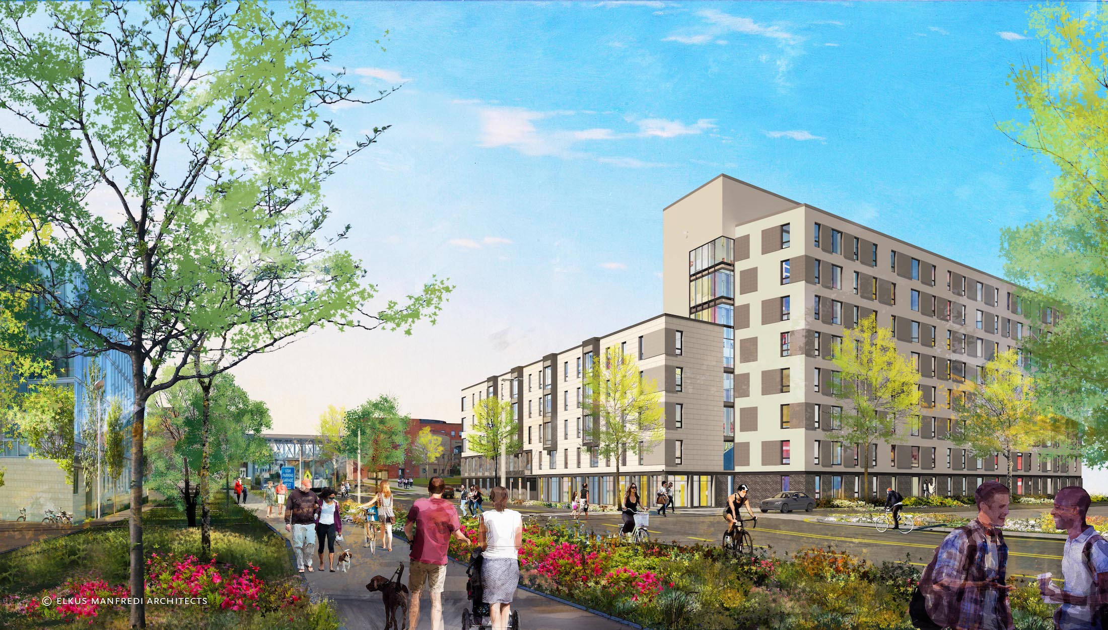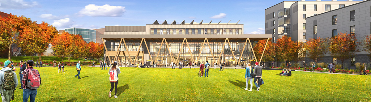 Rendering of Residential Quad (center), with a view of the Career & Student Success Center and Portland Commons Residence Hall