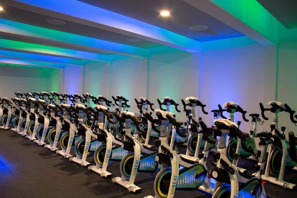 Upbeat Cycling’s new cycling studio has acoustical soundproofing in the floors, walls and ceiling to enhance the sound system and high-end lighting with more than a dozen programs, all with gentle changes rather than strobe effects.
