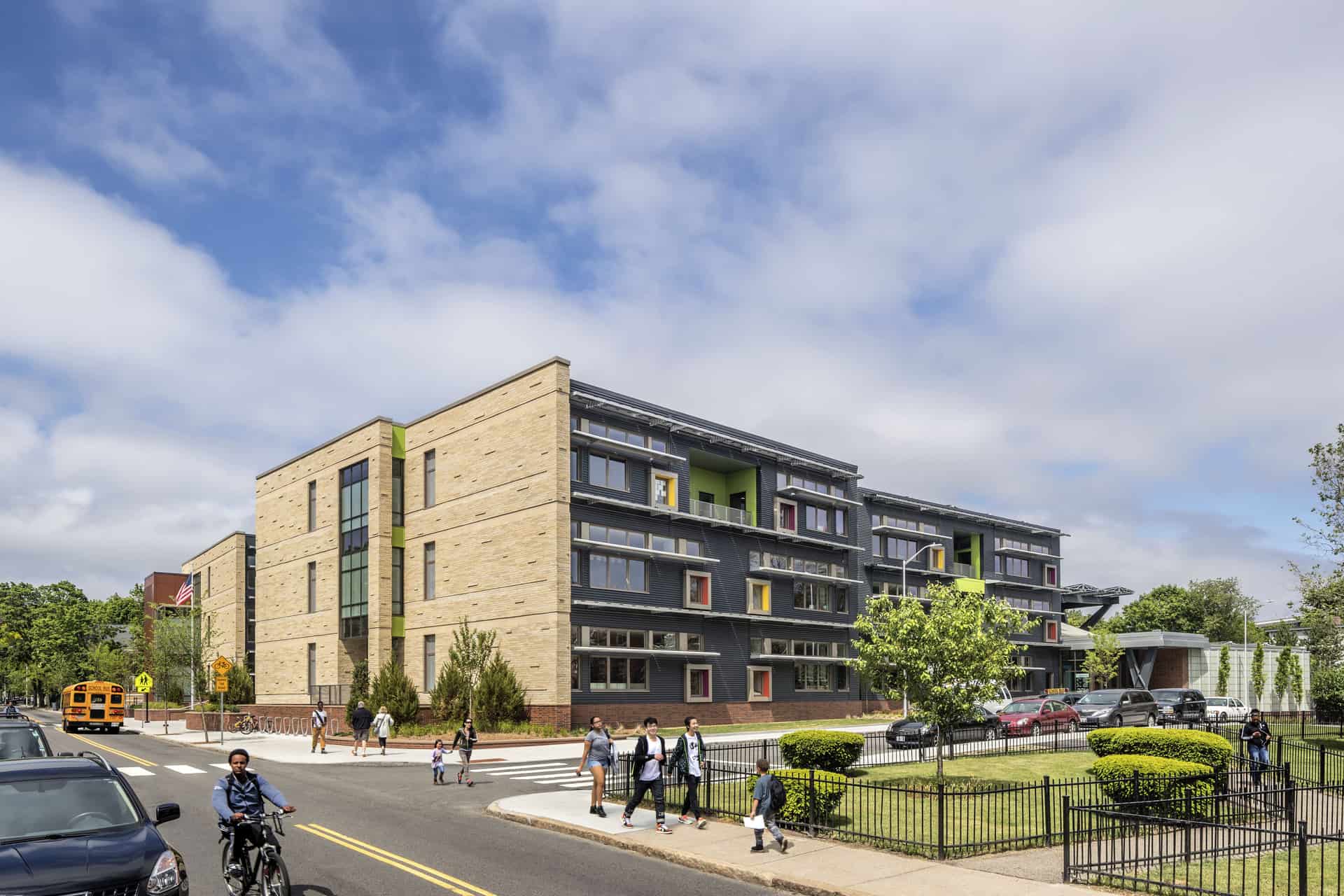 The project’s exterior consists of a number of façade materials including face brick, silicate brick, metal plate panels, formed metal panels, fiber cement panels, and a significant amount of curtainwall and punched window openings. Its landscaping uses plants and other vegetation that are native to the area and that require minimal irrigation. The interior consists of terrazzo flooring on the ground floor with marmoleum used throughout all corridors and classrooms and ceramic tile in all bathrooms and showers.