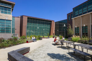 Cape Cod Regional Technical School (CCRT) in Harwich, Mass., with DRA Architects, features two courtyards that can be utilized by students and faculty as spaces for eating lunch, outdoor learning, socializing, or hosting events. The school campus features many other outdoor spaces such as an entrance plaza with an engraved map of Cape Cod, an outdoor cafe supported by the culinary program, a substantial green roof and roof terrace, and an extensive athletic complex.