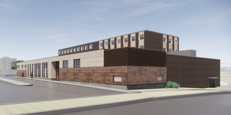 Quinsigamond Community College’s Surprenant Hall and Hebert Auditorium (QCC) is a case in point. The 62,000sf building houses classrooms and an auditorium, and like many of its brethren on campuses across the country, is distinguished mainly by its deferred maintenance and its monotonous, if rhythmic, vertical window pattern accented in gold that marches down the otherwise dull four-story brown brick rectangle.