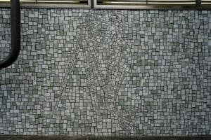 The mosaic map includes a gold dot to represent South Station, with various shades of grey used to show roads (light grey), railroads (medium grey), and subways (dark grey). Blue and green tiles show waterways and the ocean, recognizing the natural water transportation network. Three mermaids are hidden in the ocean, working together to survey the land across from them, while representing the often-hidden ways in which women have historically contributed to the transportation industry.